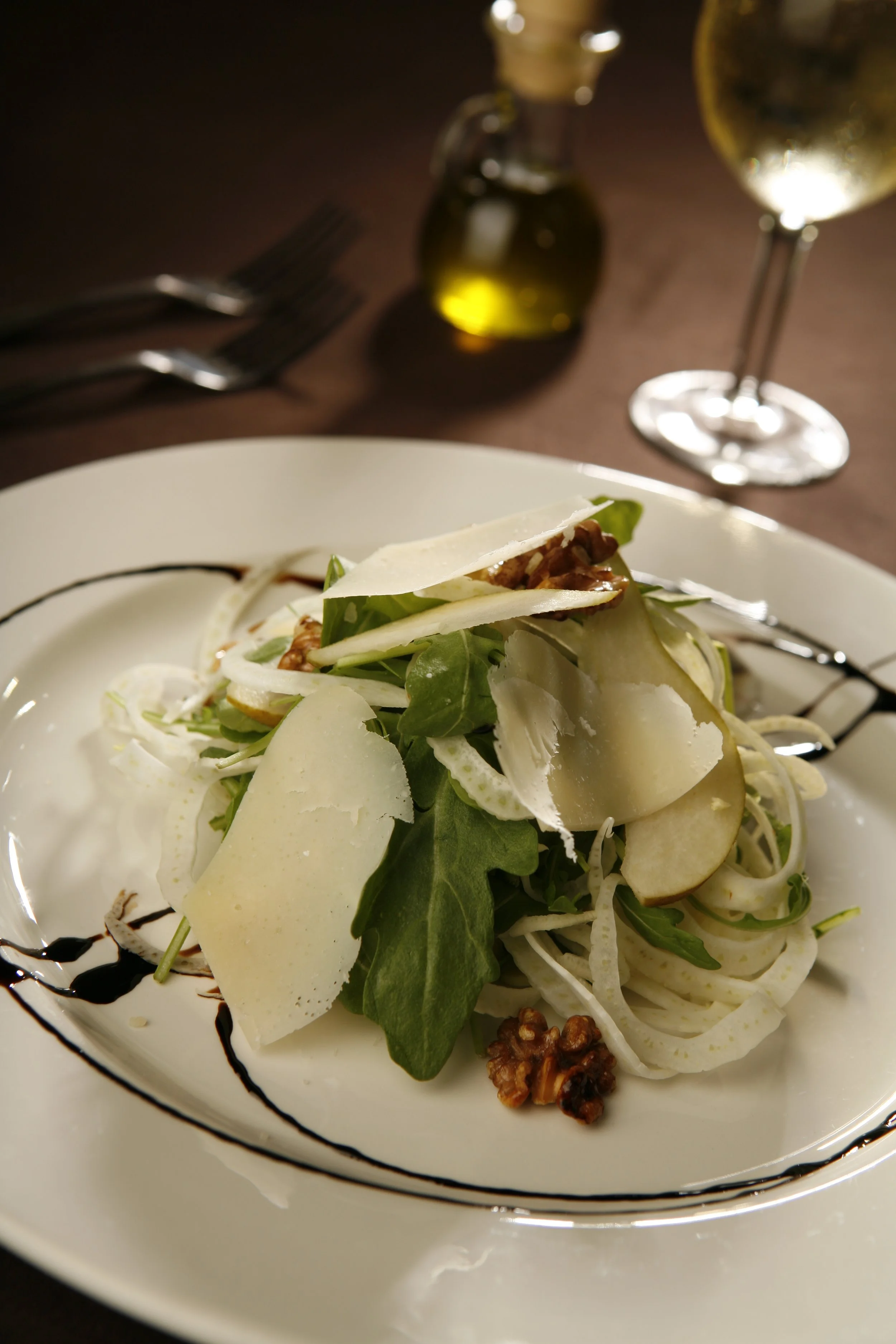 Gourmet salad with shaved cheese, arugula, sliced pear, and walnuts, garnished with balsamic glaze on a white plate. Olive oil and a glass of white wine in the background.