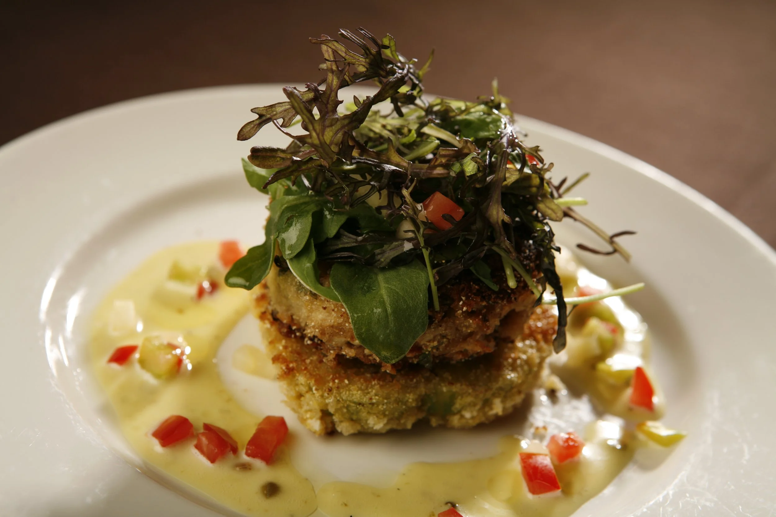 Jumbo lump crab cake with panko crusted fried tomato, baby greens and lemon caper aioli on a white plate