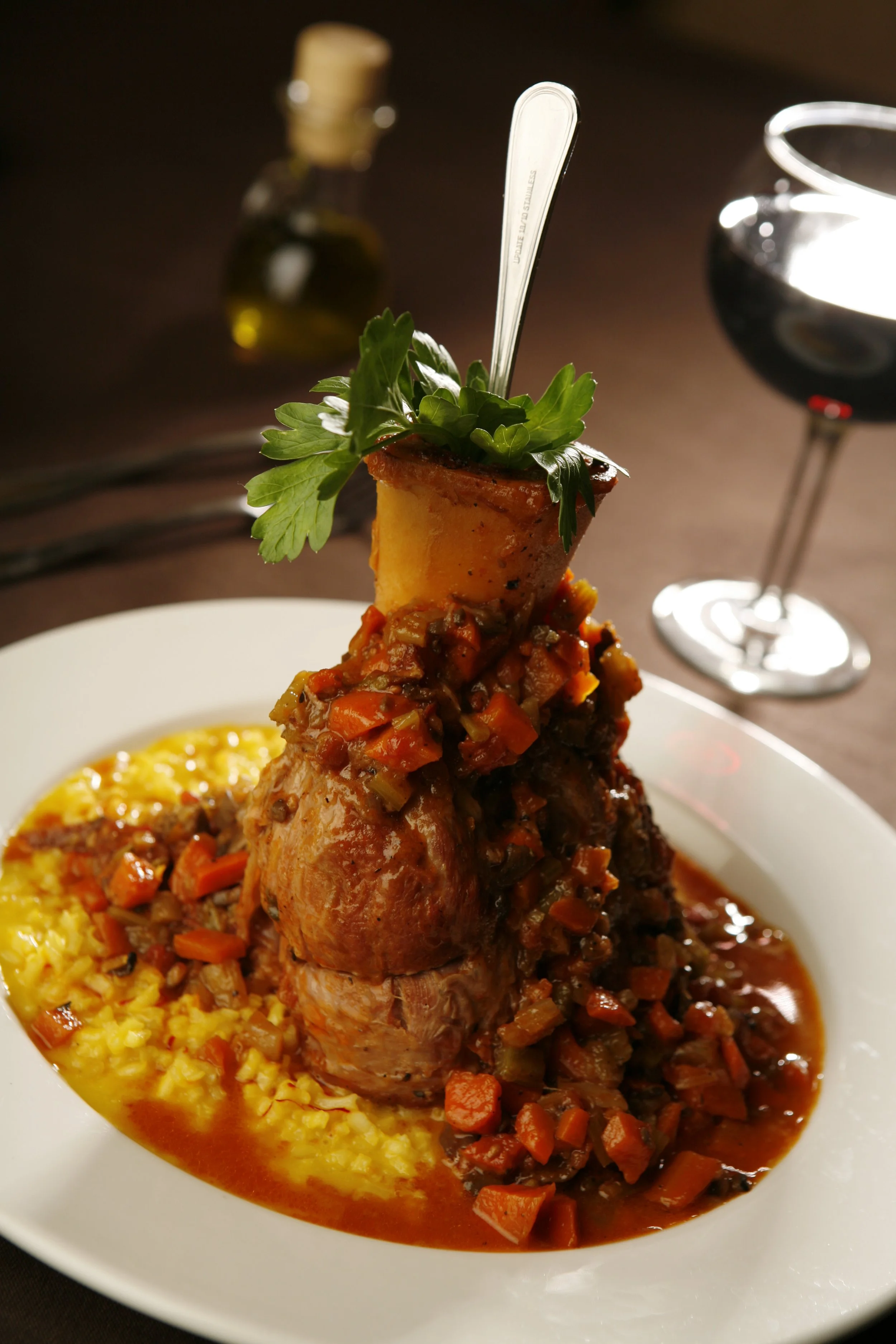 Osso buco dish with braised veal shank, vegetables, and saffron risotto, garnished with parsley and accompanied by a glass of red wine.