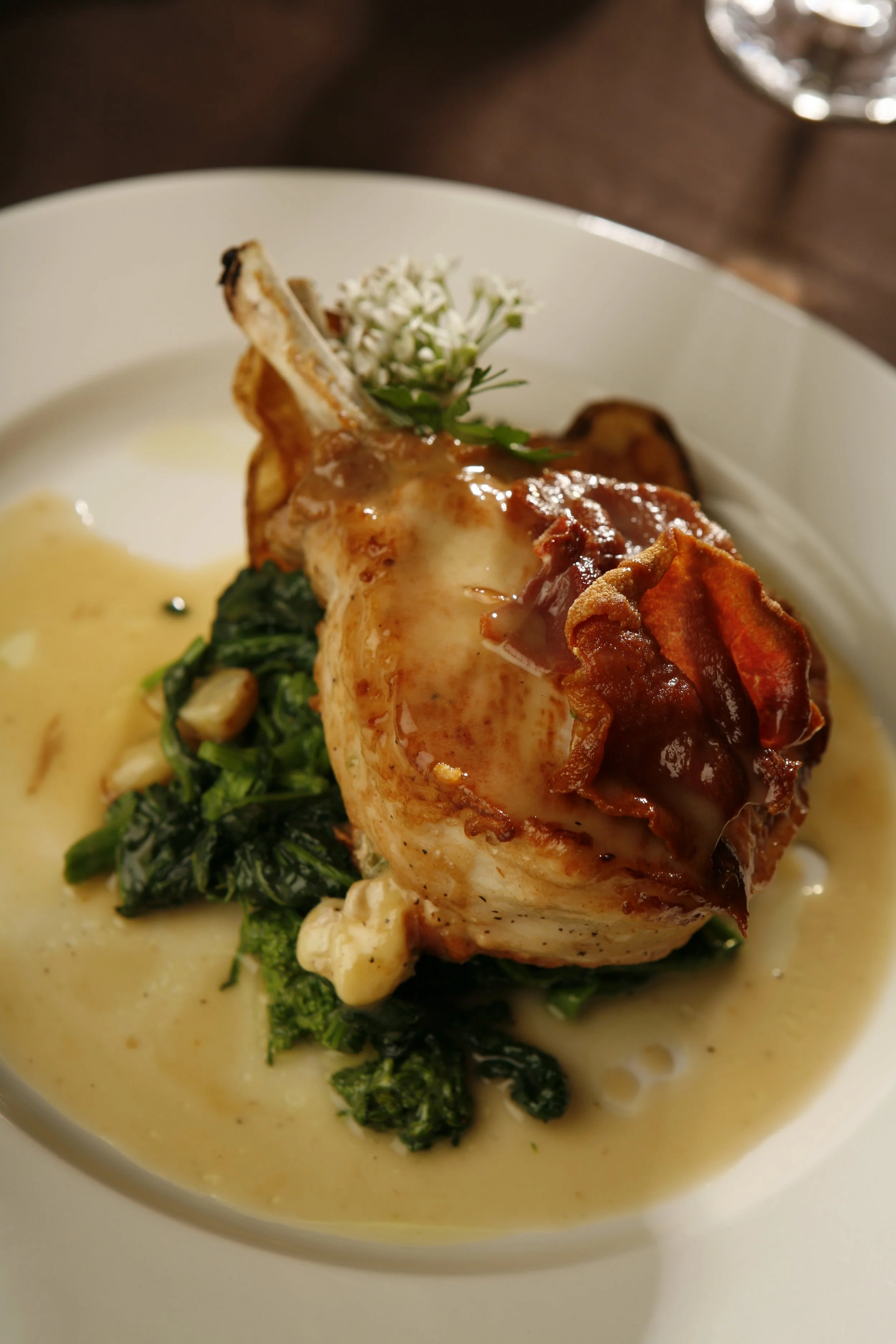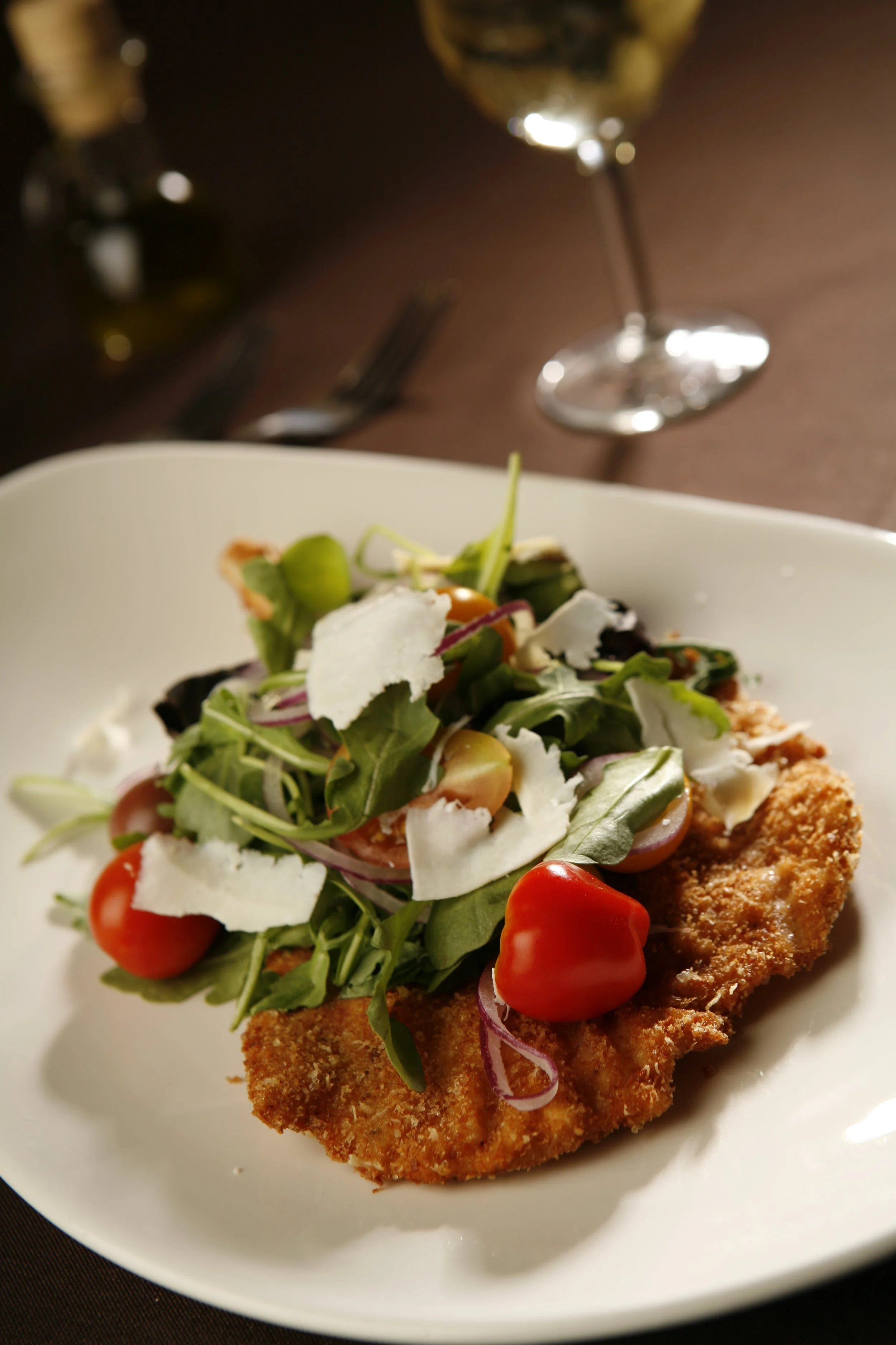Plate with breaded veal chop Milanese topped with arugula, cherry tomatoes, onion, and parmesan shavings, next to wine glass.