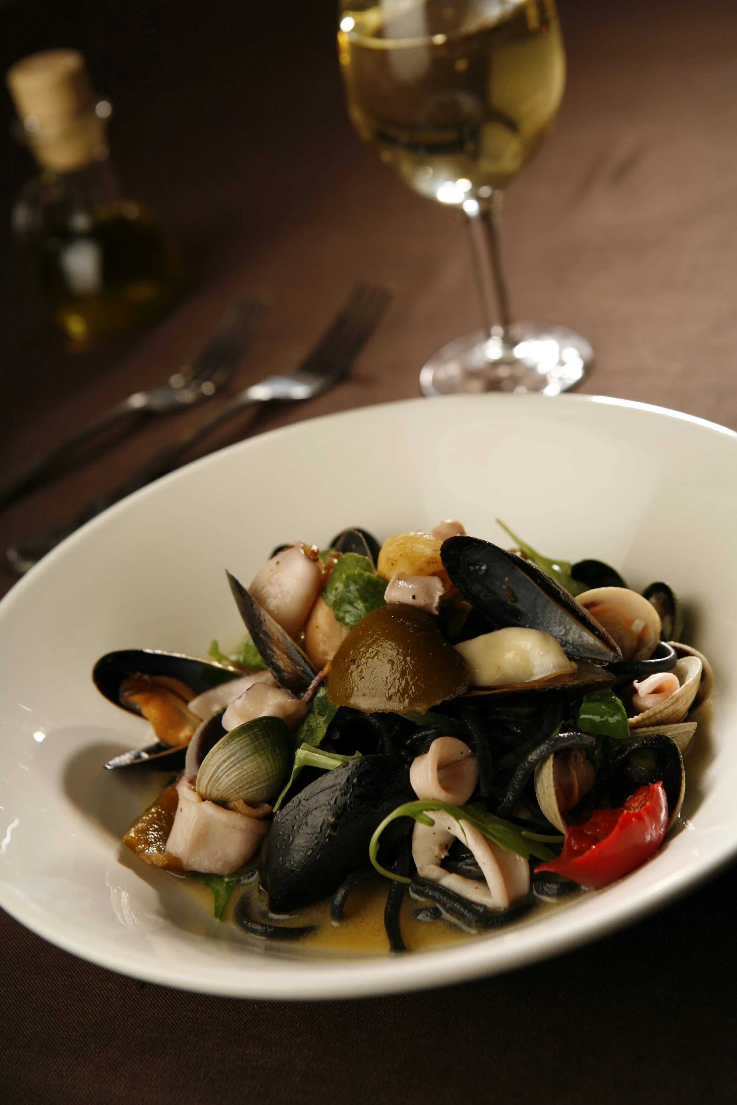 Plate of seafood pasta with mussels, clams, squid, black pasta, and greens, accompanied by a glass of white wine and a bottle of olive oil on a brown tablecloth.