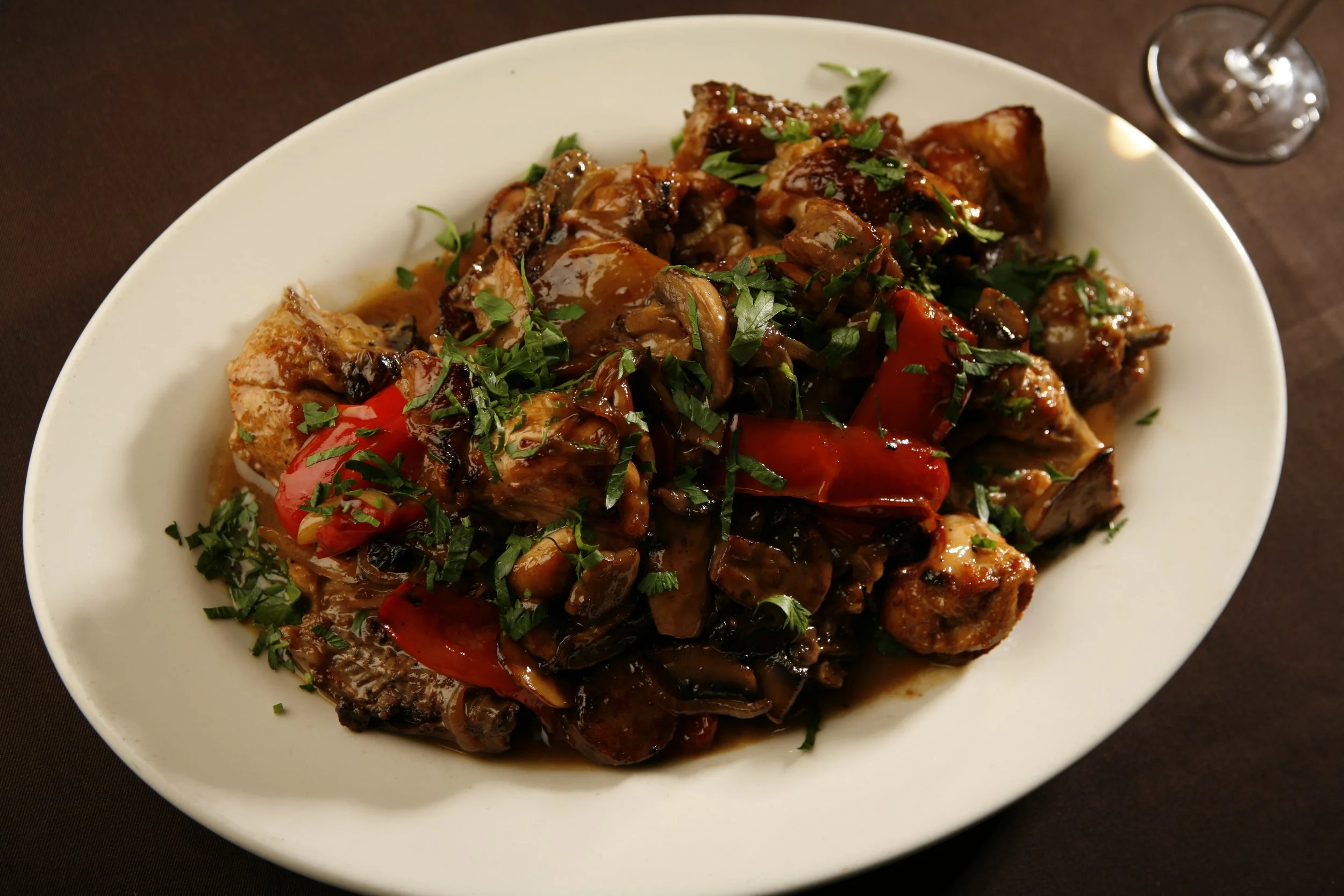 Plate of Chicken Campagnola with mushrooms, sausage, red bell peppers, potatoes, and fresh herbs.