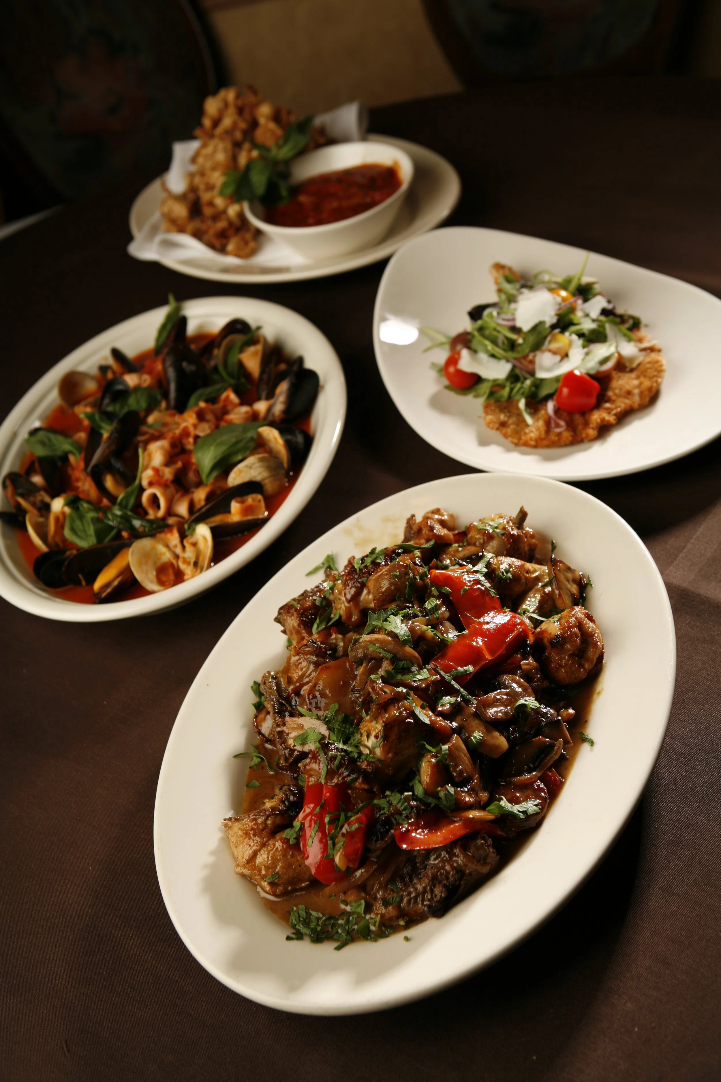 A variety of Italian dishes on a table, including a seafood pasta with mussels and clams, a meat dish with mushrooms and peppers, and a salad with greens, cherry tomatoes, and cheese shavings. Another plate has crispy fried items with a bowl of dippi