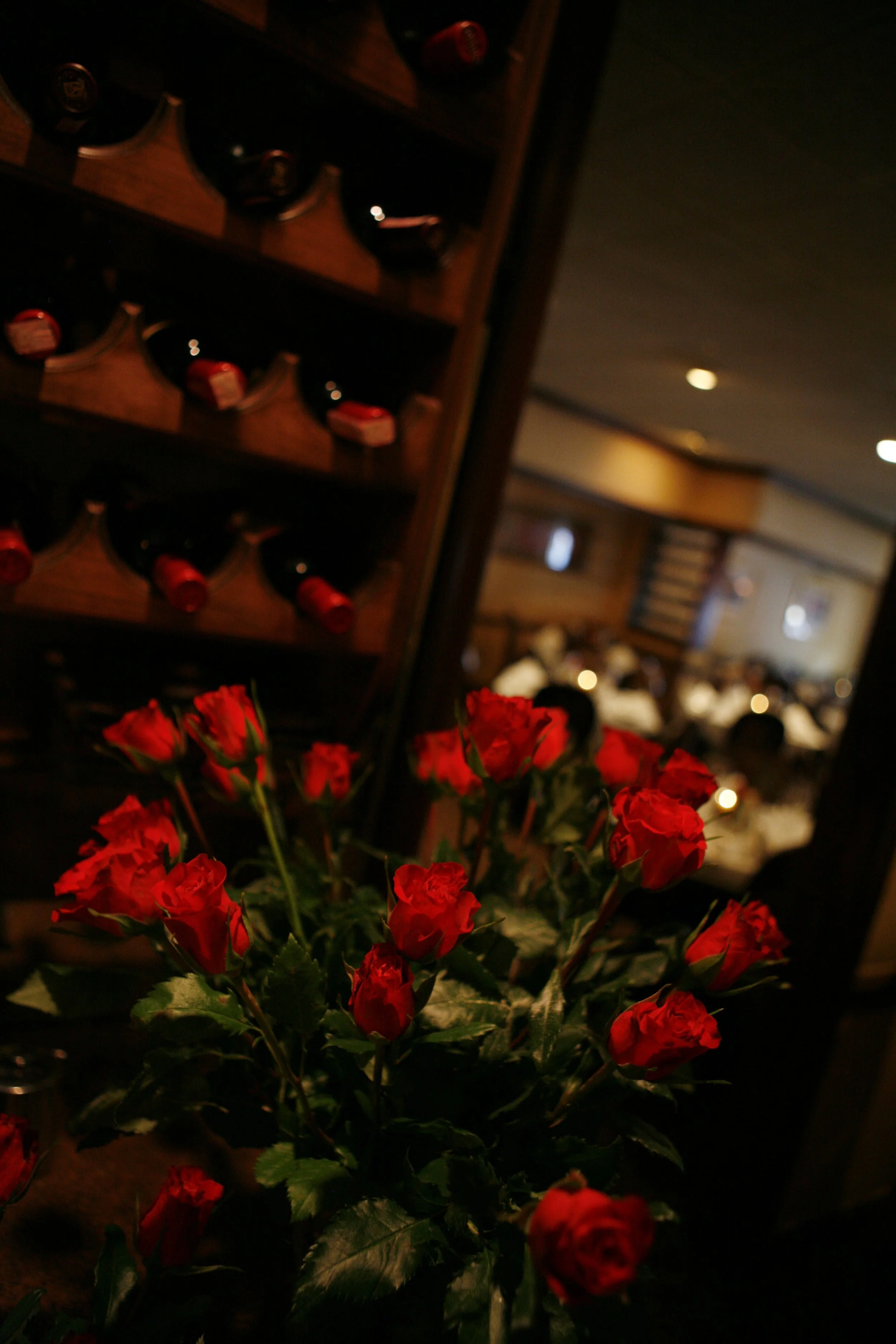 Red roses in a vase with a wine rack in the background in a dimly lit restaurant.