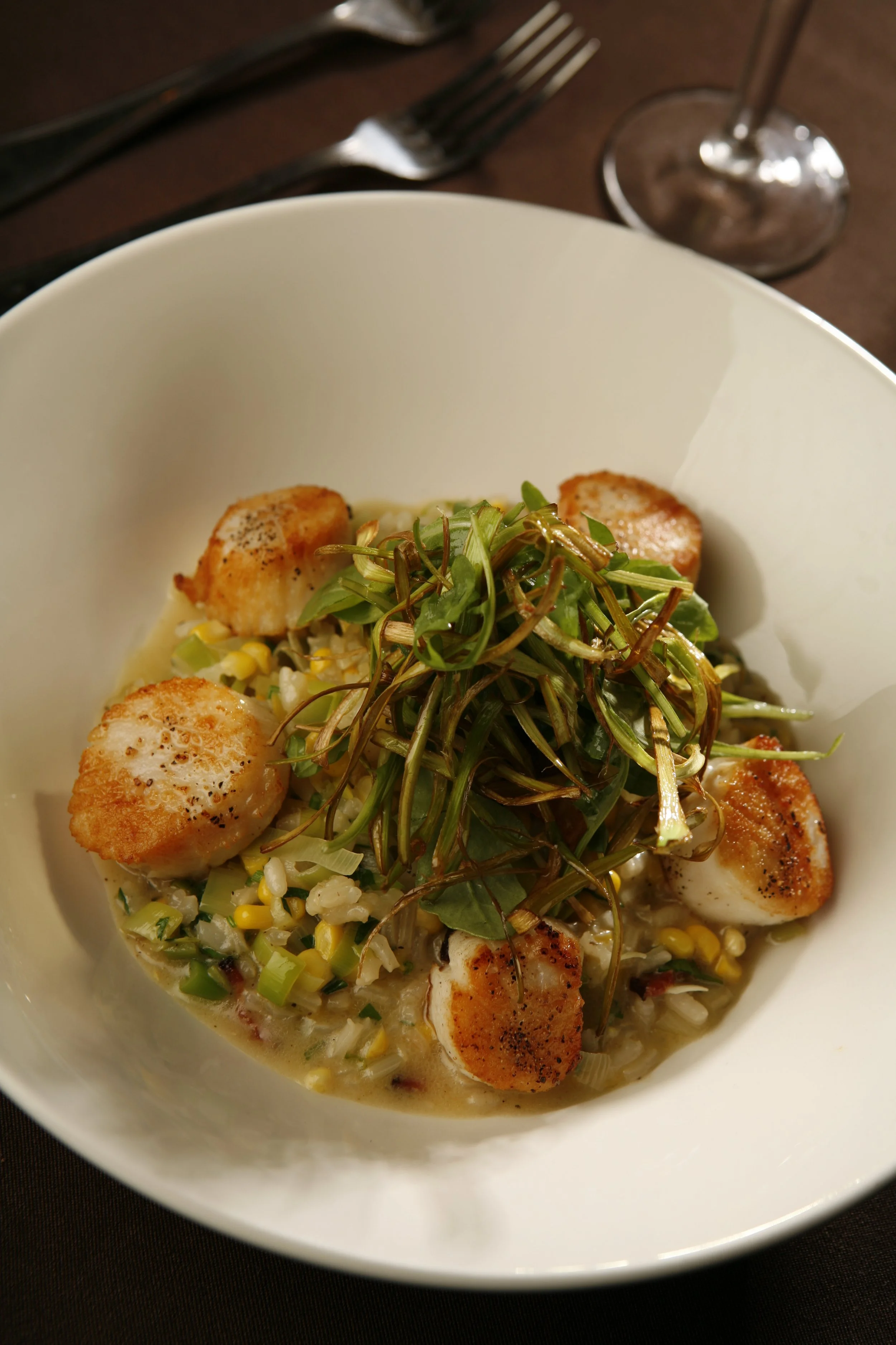 Pan-seared scallops on creamy risotto with corn, topped with greens and herbs in a white bowl.