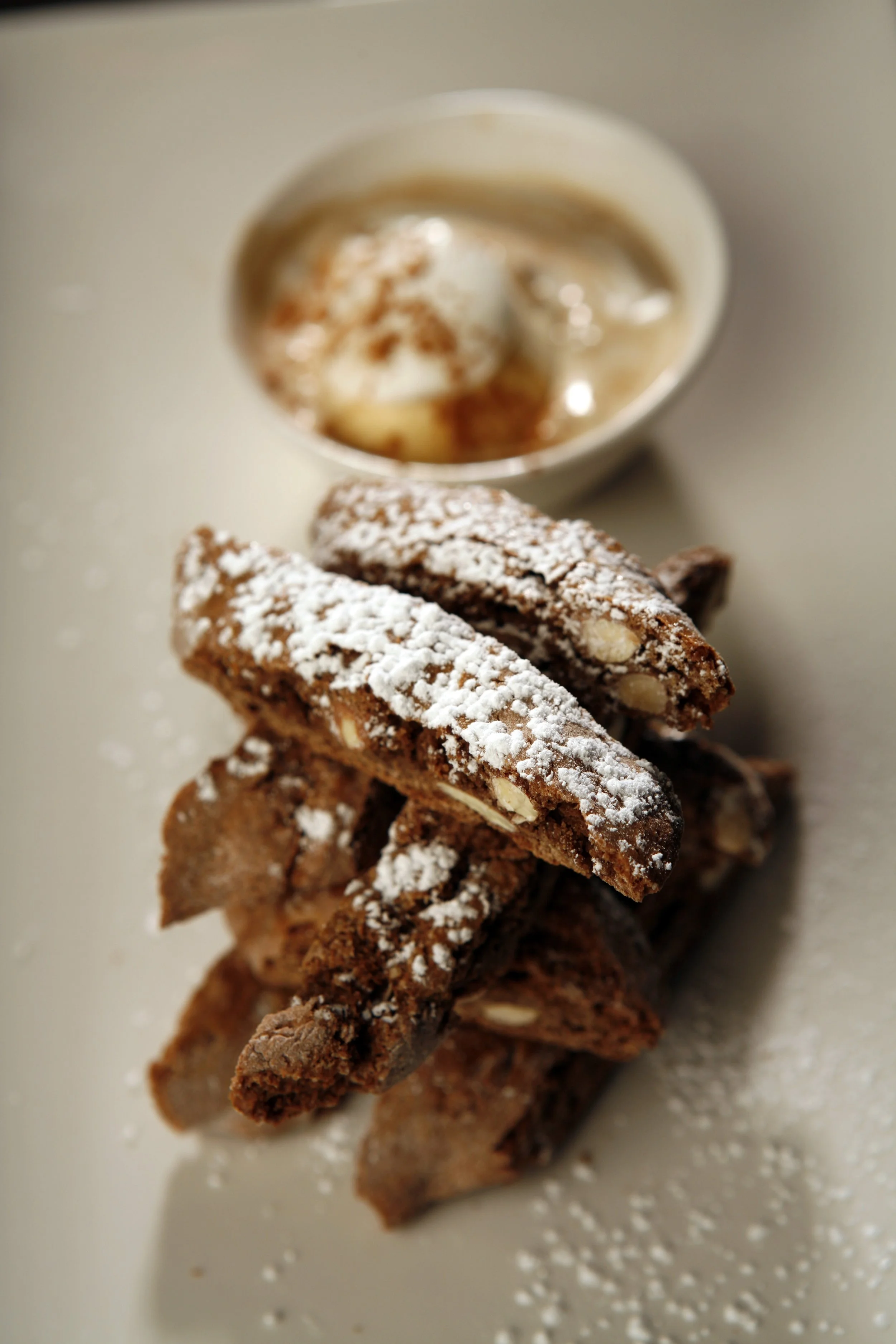 Stack of chocolate biscotti dusted with powdered sugar with a bowl of ice cream in the background.