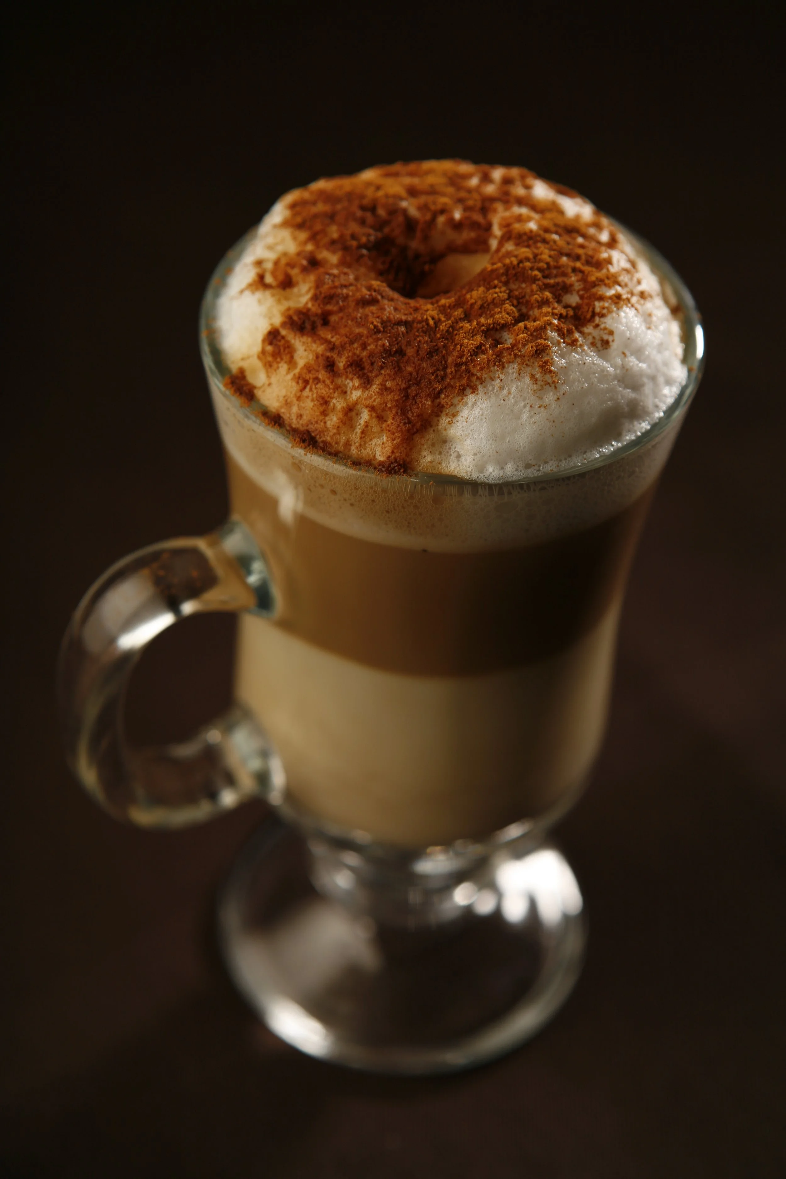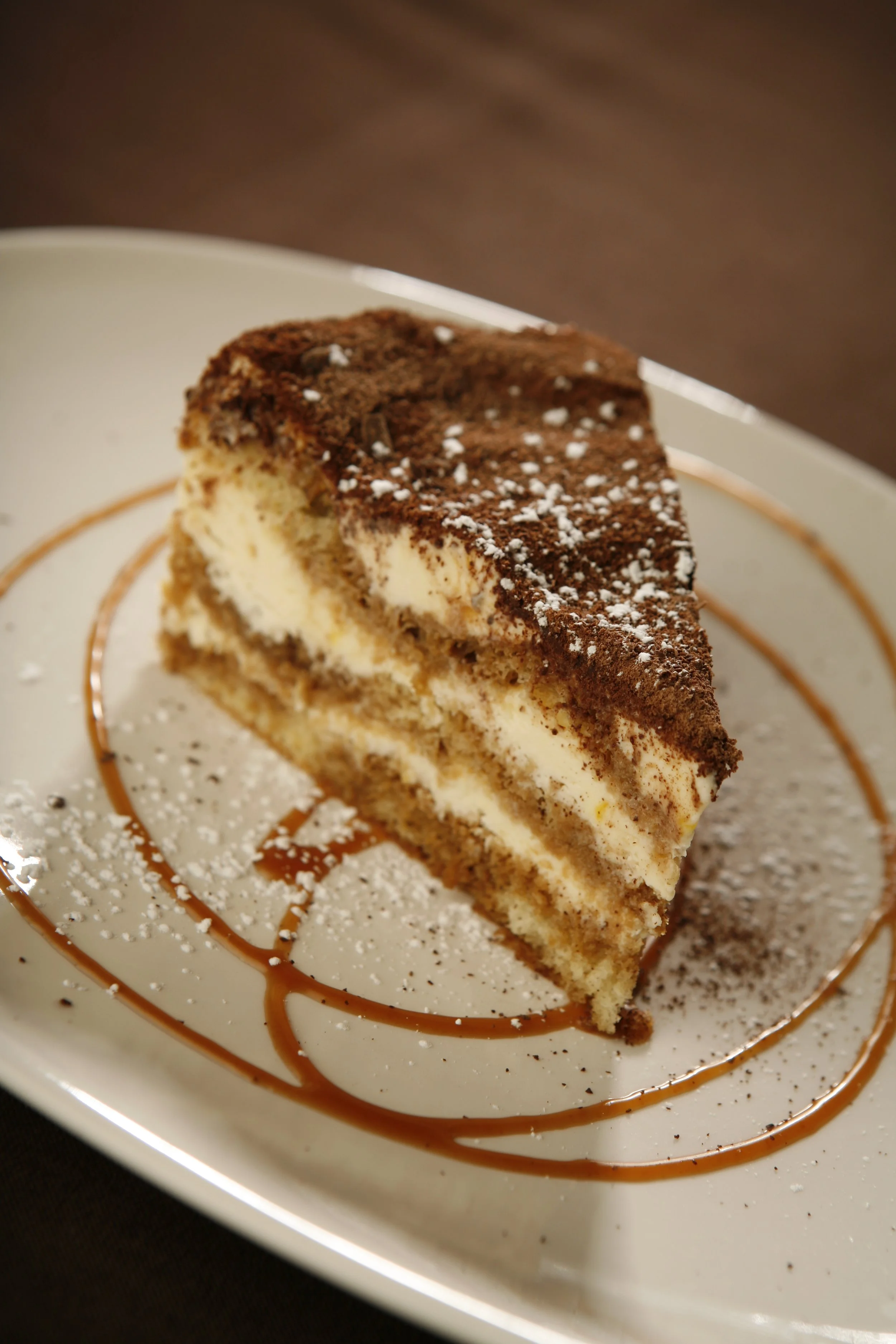 A slice of tiramisu on a white plate with cocoa powder and drizzled caramel.