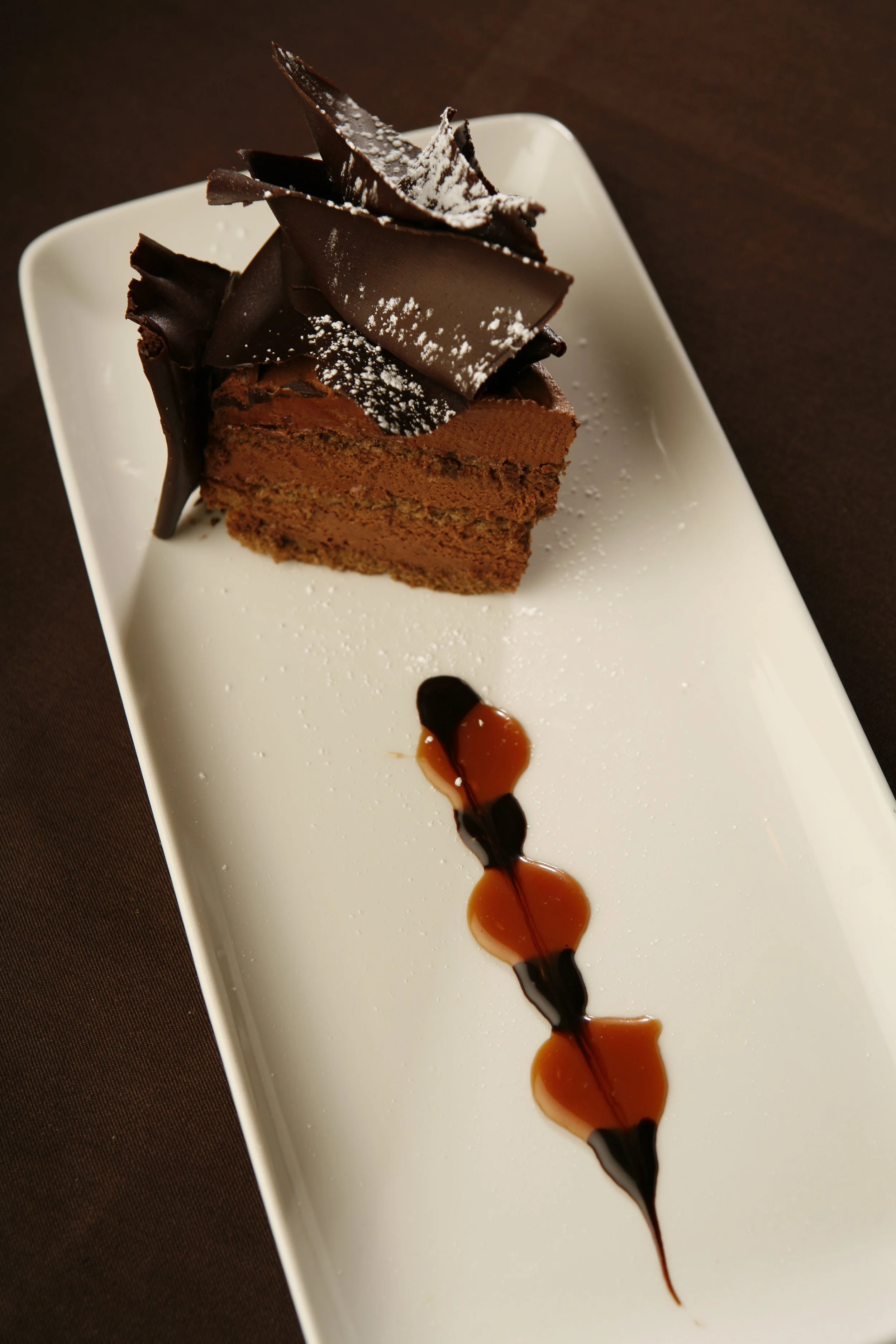 Slice of layered chocolate cake with chocolate shavings on a plate, garnished with caramel sauce.
